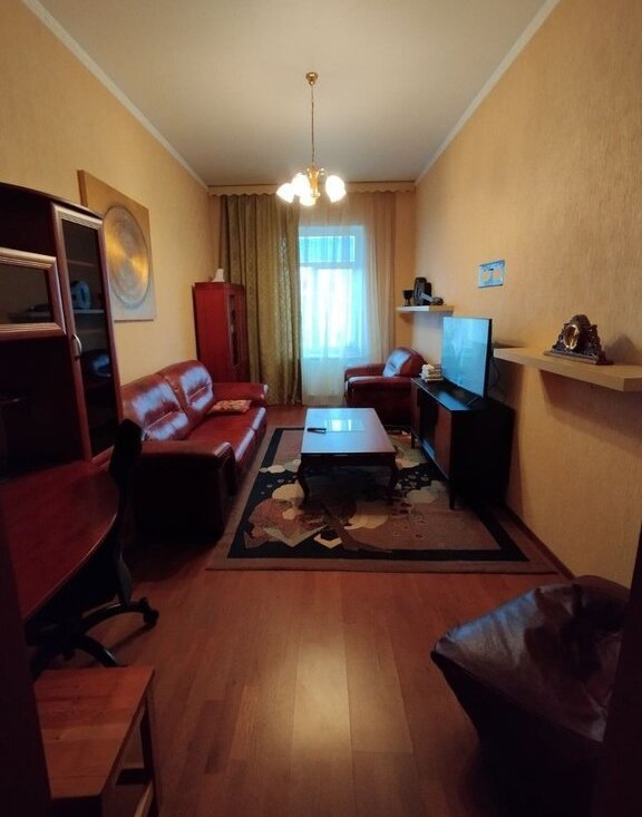 В спальне спальный гарнтитур: комод, тумбочки, кровать. Новый матрас, наматрасник. Электрокамин. Гардеробная. В гостиной: комьютерный стол, кожаный диван и кресло, деревянный книжный шкаф и тумба, телелевизор, ковер, полочки и журнальный стол. Во второй спальне: шкаф для одежды, деревянный винтажный стол, винтажный деревянный комод, диван-кровать.