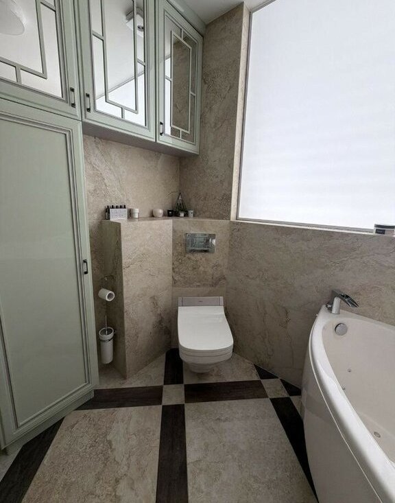 Главная особенность квартиры — наличие собственной джакузи, позволяющей расслабляться после рабочего дня, не выходя из дома. В квартире два совмещенных санузла, что добавляет бытового комфорта и исключает утренние очереди.