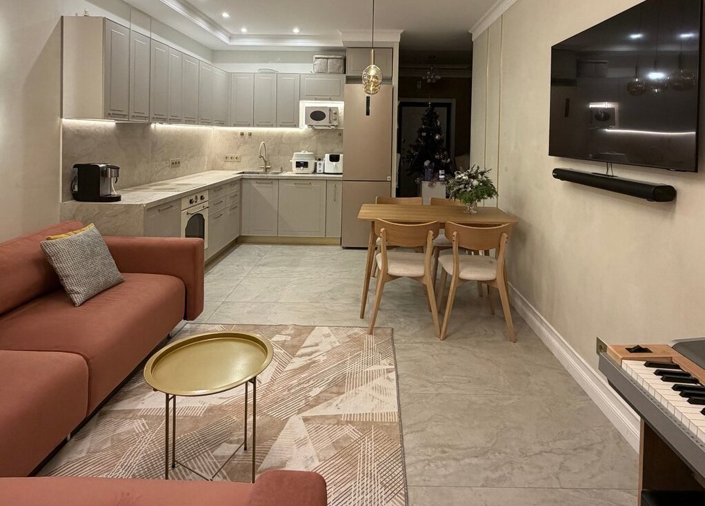 Удобная планировка, просторная кухня-гостиная, спальня, детская комната, рабочая комната, санузел с душем, ванная комната, лоджия. Есть вся необходимая бытовая техника: холодильник, духовка, микроволновка, варочная поверхность, вытяжка, посудомоечная машина, стиральная машина, телевизор. Фильтр на питьевую воду. Обеденная группа из натурального дерева. Люстры и бра из камня, ракушек, хрусталя. Вся мебель и техника остается, или обсуждается по желанию покупателя.