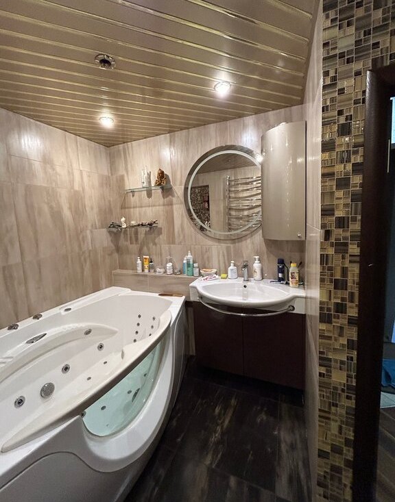Полы в квартире паркетная доска и дизайнерская плитка. Теплый пол: прихожая, ванная, кабинет, кухня. В ванной комнате душевая кабина Jacuzzi c гидромассажем и парогенератором. Ванная с двумя мощными моторами для гидромассажа размером 2*1.2 метра.