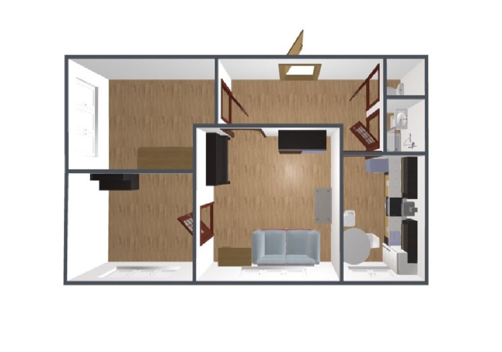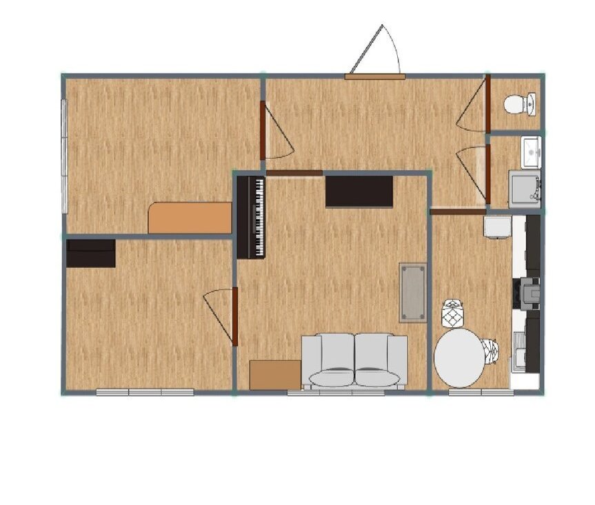 Планировка комнат позволит комфортно разместиться семье с детьми, или фрилансерам обустроить кабинеты для удаленной работы (в доме хорошие интернет провайдеры). Проходную комнату можно зонировать и сделать отдельную зону отдыха.