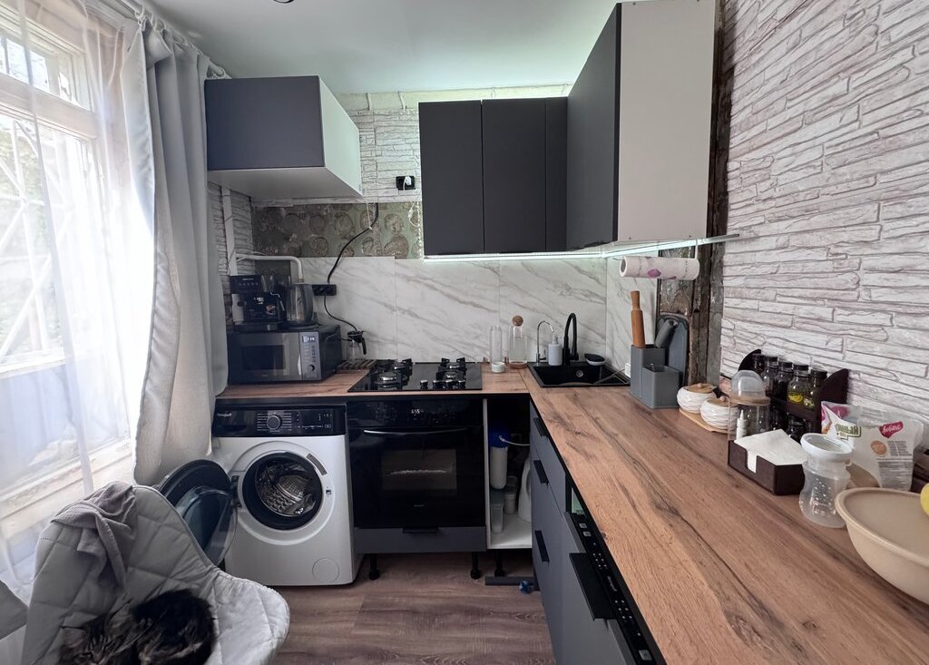 Кухня площадью 6 м² оборудована современной техникой, включая холодильник, плиту, чайник , свч, духовой шкаф, стиральную и посудомоечную машину, фильтр центральной воды. В квартире выполнен косметический ремонт, стены украшены стильными обоями. Из мебели имеются шкафы, комоды и удобные кровати.