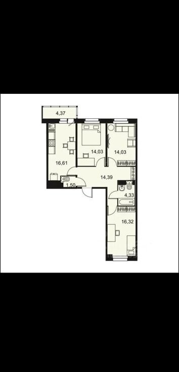 Общая площадь квартиры составляет 82 кв. м, из которых 44 кв. м — жилая площадь и 16.6 кв. м — кухня-гостинная, две комнаты по 14 м и спальня 16 м.