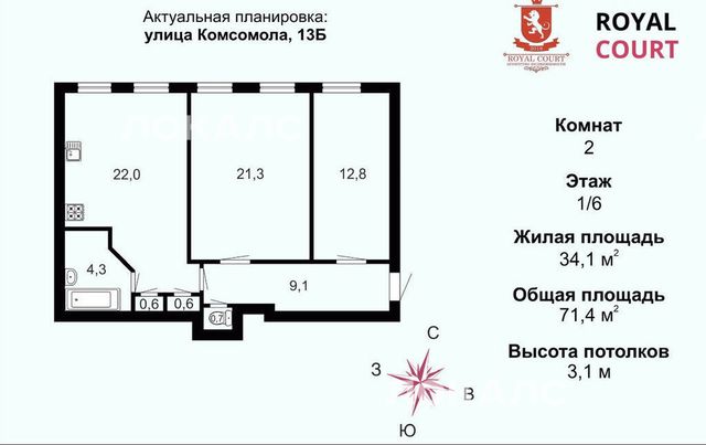 3-комнатная квартира: Санкт-Петербург, улица Комсомола, 13 (72 м²)
