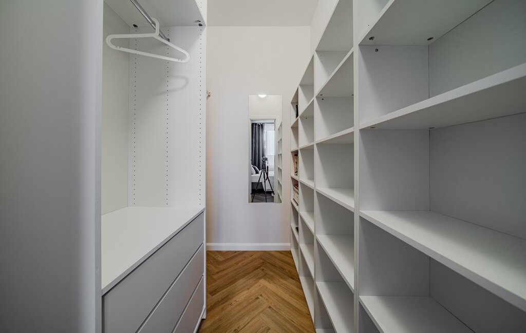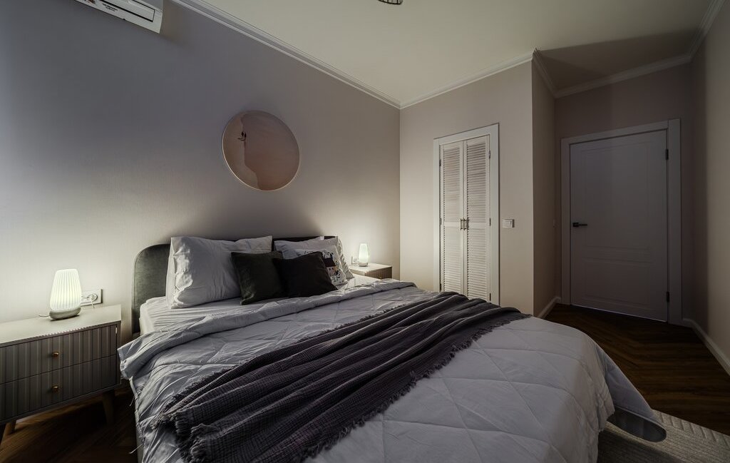Спальня: двуспальная кровать, кондиционер, рядом гардеробная с системой хранения.