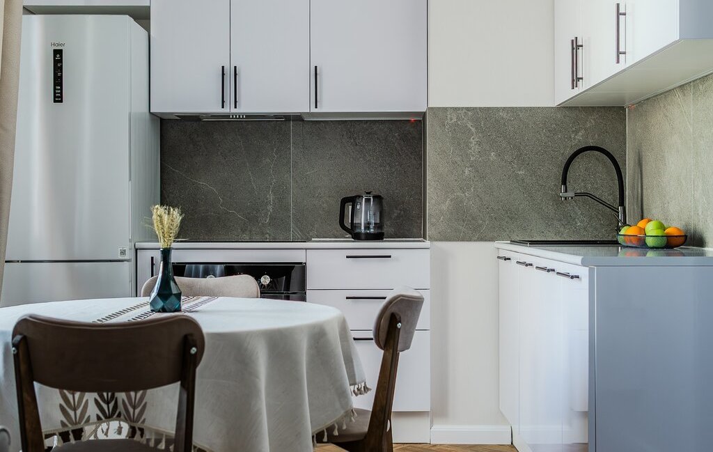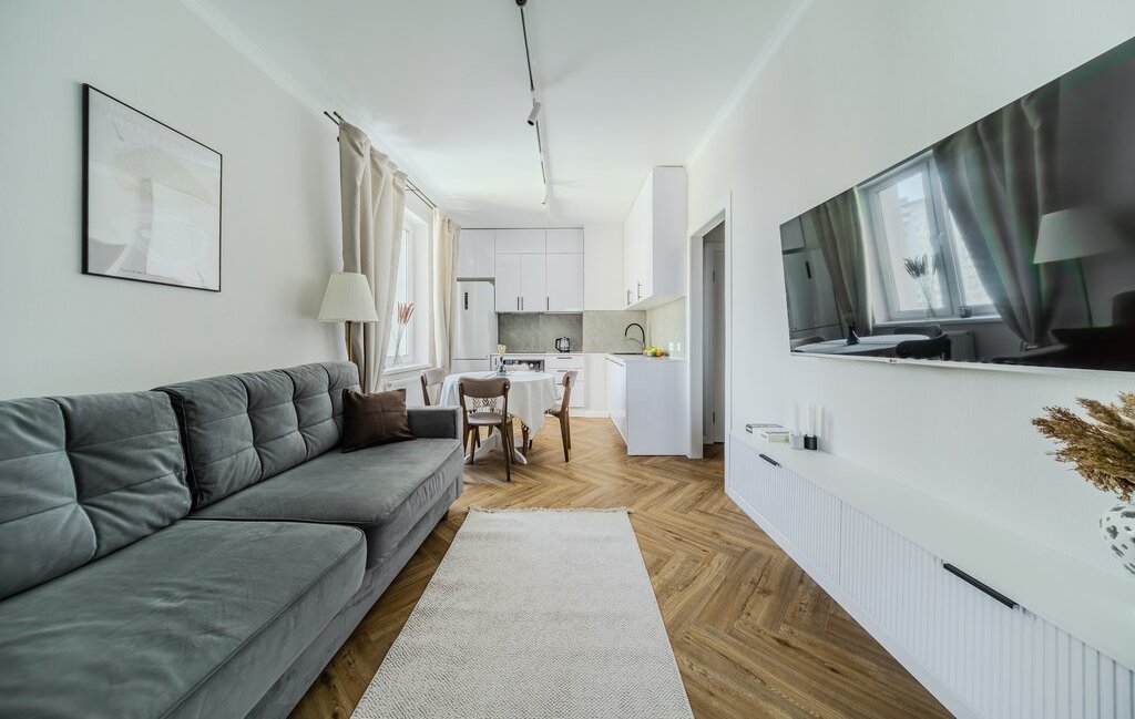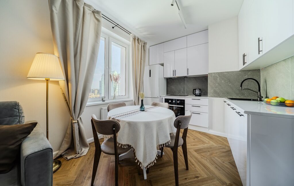 Кухня-гостиная: ТВ, тумба с подсветкой, трековые светильники (дневной/вечерний сценарий), полностью новая кухня. Техника Haier: посудомойка, холодильник, стиральная машина, плита/духовка. Есть фильтр питьевой воды, подсветка кухни, круглый раскладной стол.