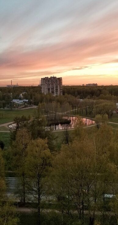 С лоджии открывается красивый вид на сад Бенуа и парк Сосновку — зелёная панорама без ощущения окна в окна.