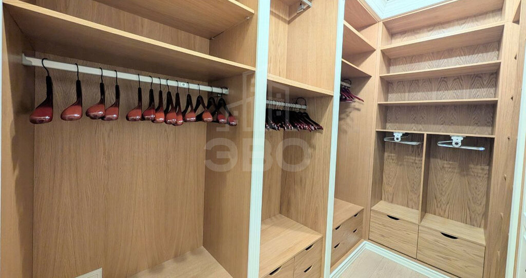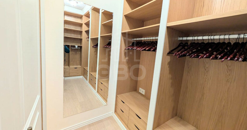 · Гардеробная (6,5 м²): Профессионально организованное пространство для хранения с зеркалом, множеством секций и местом для всех бытовых мелочей.
