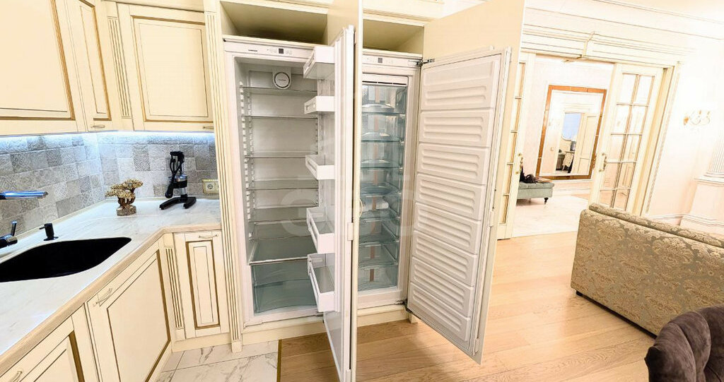 Просторное светлое пространство для жизни, общения и приема гостей. Итальянская кухня гармонично сочетается с зоной отдыха. Техника премиум-класса (Liebherr, Asko) и инновационный кран с системой очистки воды делают готовку удовольствием. Обеденный стол-трансформер для больших ужинов, комфортный диван и выход на утепленную лоджию с видом на тихий сквер — здесь есть место всему.