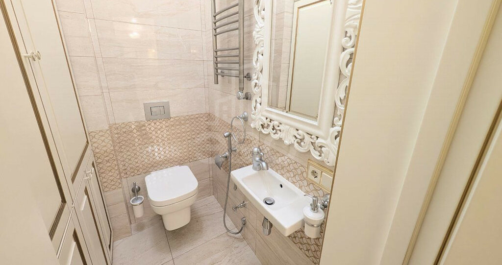 · Два санузла: Гостевой с интегрированной техникой за фасадами и основной с величественной чугунной ванной и стильной тумбой. Повсеместно — итальянская сантехника матового покрытия.