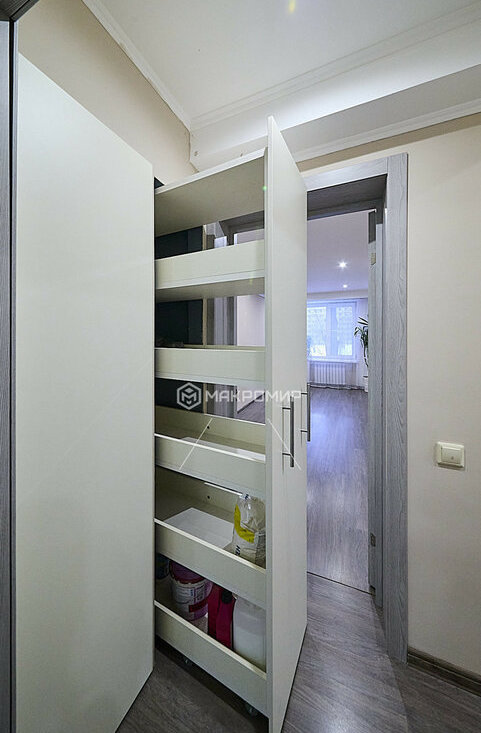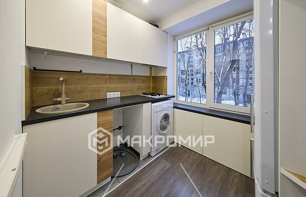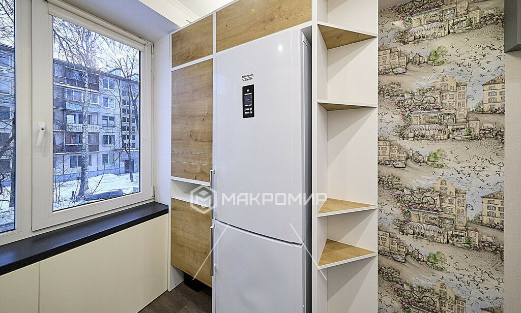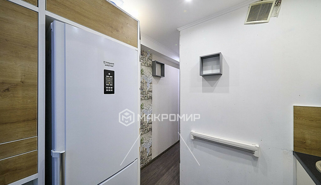 Квартира оборудована кухонным гарнитуром с варочной панелью (2 конфорки), вытяжкой, большим двухкамерным холодильником, новой стиральной машиной, обеденным гарнитуром. Есть две небольшие удобные кладовочки для хранения и вместительный шкаф в прихожей