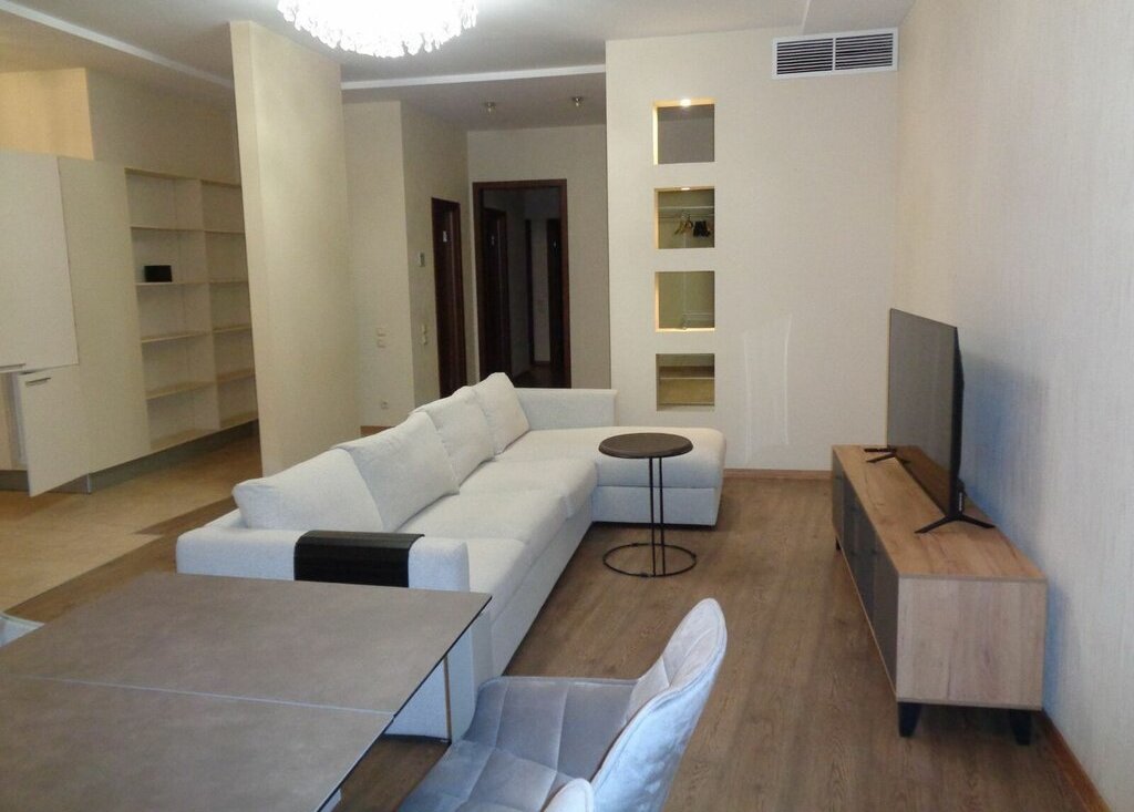 В новом комплексе Бизнес Класса (2006) на Воскресенской наб., 4 сдается на долгий срок 3-х кк видовая квартира с панорамными видами на Неву 110,95 м2 с балконом. В квартире выполнен качественный Евро ремонт. Комплекс имеет большую благоустроенную охраняемую закрытую территорию с детской площадкой и зеленью. При комплексе есть спа и фитнесс центр «Парус" с бассейном. Панорамные виды на Неву из больших окон гостиной-кухни (45,3 м2). 2 спальни (16, 7 м2 + 16,6 м2) выходят окнами в тихий закрытый Евро двор с зеленью и детской площадкой, из обеих спален выход на балкон квартиры. В основной спальне установлена новая мебель, в том числе кровать 180х200 см, во второй спальне-кабинете новый раскладной диван, компьютерной стол, кресло. Одно парковочное место в подземном паркинге дома. 24-часа охрана комплекса. Система климат-контроля (притяжная вентиляция с охлаждением и нагревом воздуха), электрический подогрев полов во всех кафельных зонах (в обеих ванных, прихожей, перед встроенной кухней) и в зоне окна-эркера в гостиной. Большие встроенные шкафы (два в прихожей, один в основной спальне и гардеробная в кабинете-гостевой спальне). Оборудованная кухня , есть посудомоечная машина (60х60), электрические плита, духовка, вытяжка, холодильник. Электрический бойлер на случай отключения горячей воды. Две ванных комнаты: ванная 4,60 м2 и душевая с просторной душевой кабиной 5,45 м2. В ванной есть стиральная машина LG с функцией сушки белья. Есть функция регулировки интенсивности нагрева батарей отопления. Квартира сдается с мебелью. Стоимость парко места в подземном гараже дома включена в стоимость аренды, при этом коммунальные услуги за паркоместо оплачиваются арендатором дополнительно. Оплата коммунальных платежей за квартиру не включена в стоимость аренды и составляет в среднем около 15500 рублей в мес. , плюс к этому арендатор оплачивает по счетчикам за электричество, воду, а также за пользование интернетом.