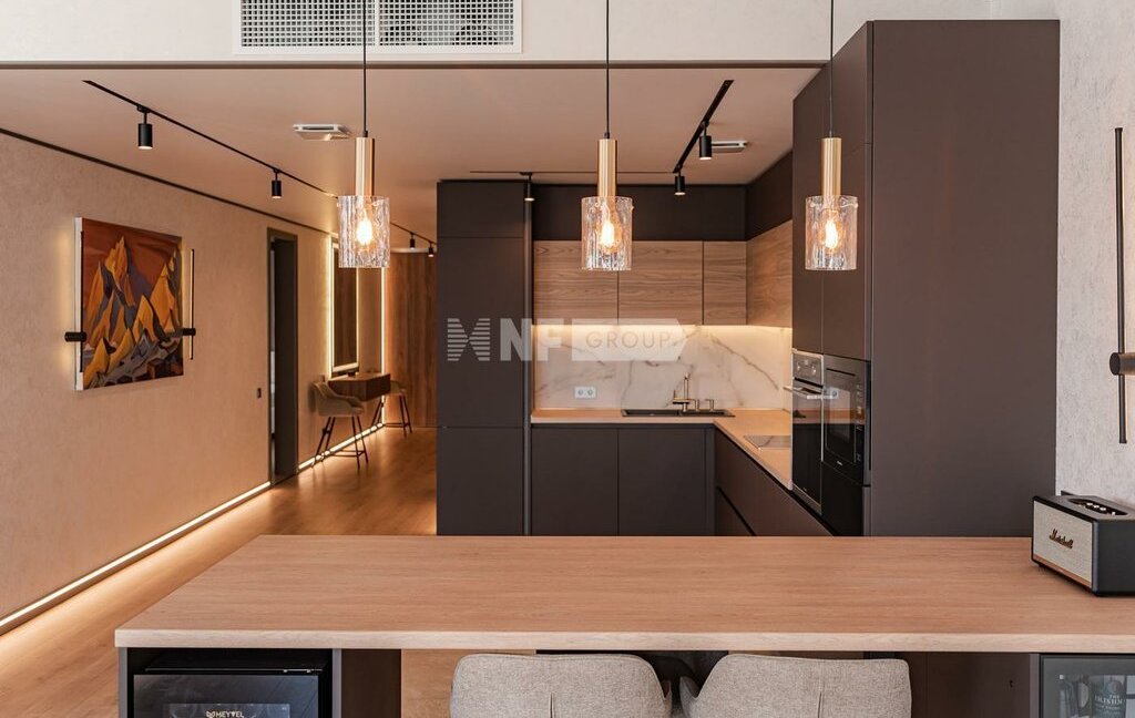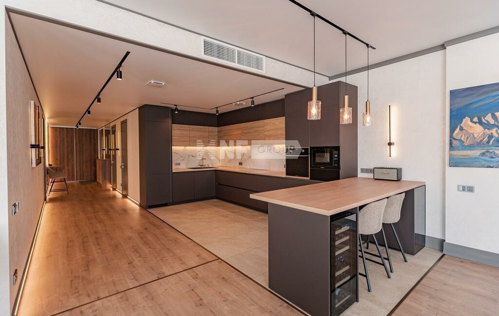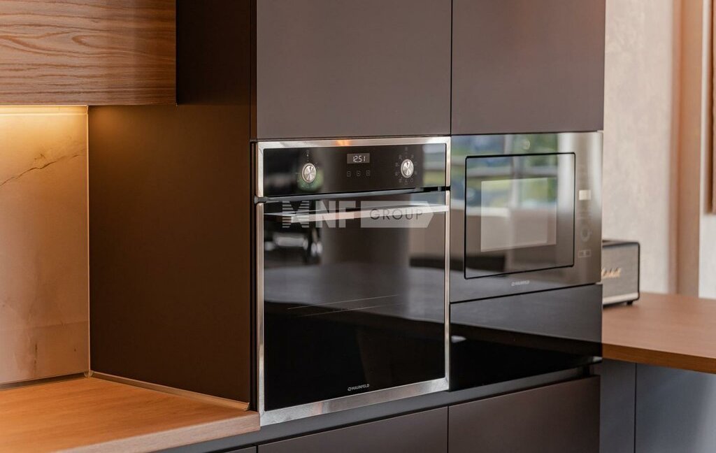 Кухня оборудована всей необходимой техникой, есть винный шкаф.