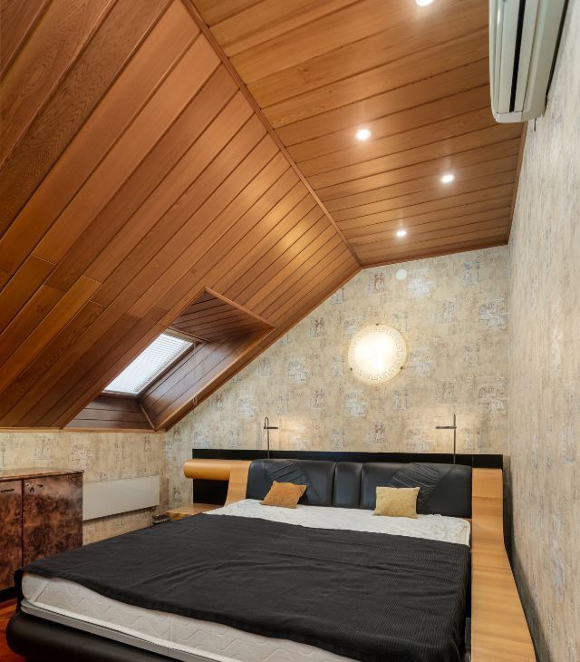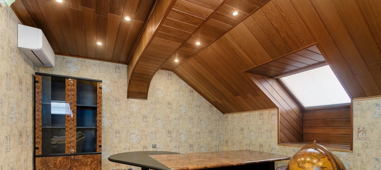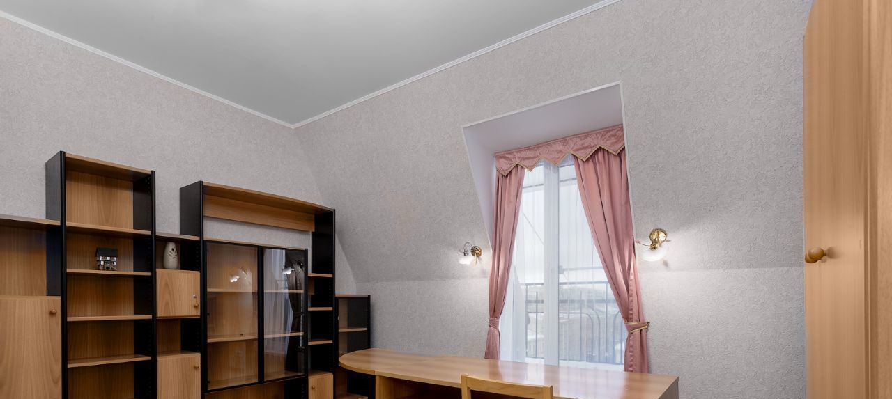 комната 42 кв.м: многофункциональное жилое помещение разделенное на три зоны рабочая, гостевая и отдыха, есть кондиционер, большой письменный стол, двуспальная кровать, окна Velux