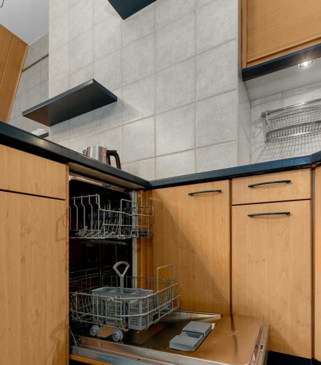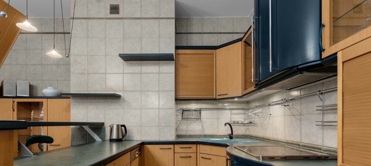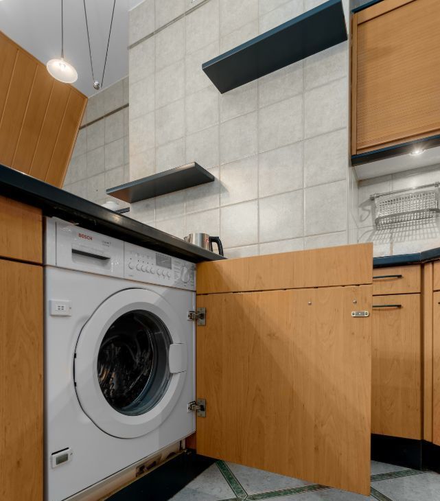 полностью оборудованная кухня: кухонная мебель и техника Bosch, в т.ч. варочная панель, микроволновка, духовка, посудомоечная и стиральная машины, два холодильника