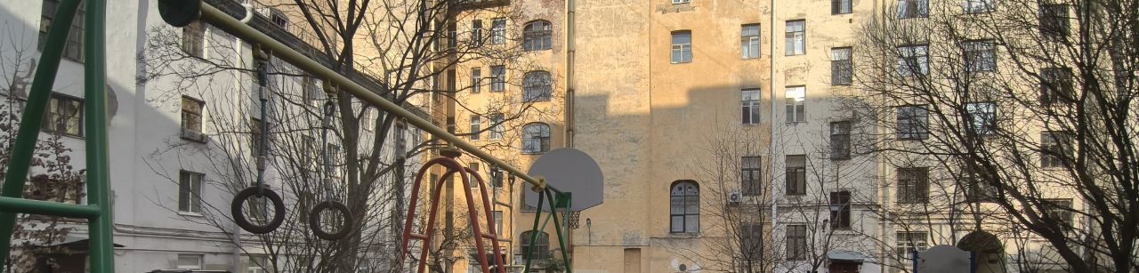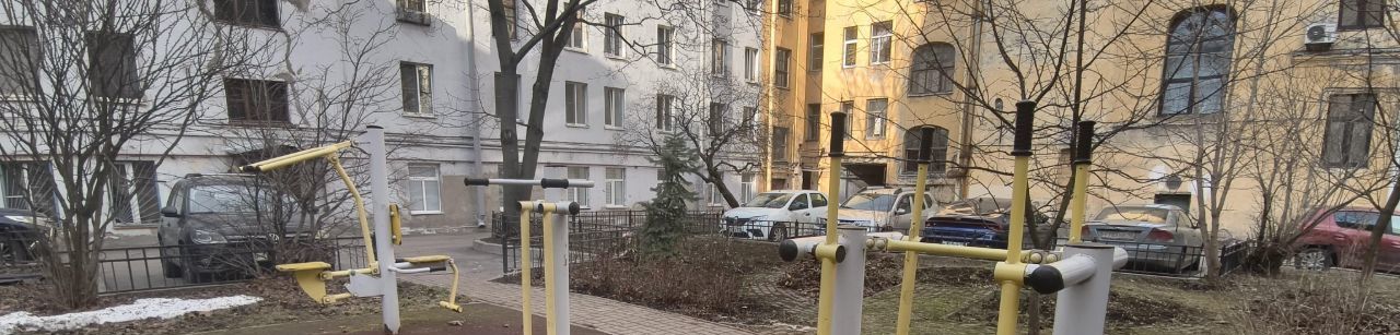 Уютный тихий солнечный дворик с детской площадкой, тренажёрами и скамеечками для отдыха.