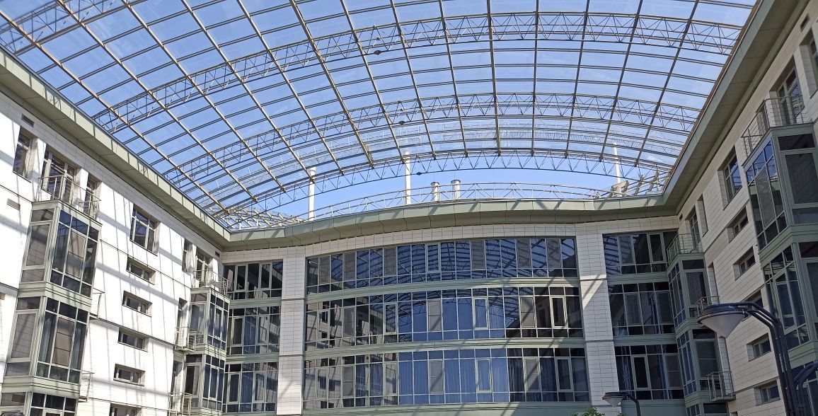 Объект спроектирован таким образом, что ограниченный жилыми секциями с тех сторон, образуется двор-атриум: он имеет защиту в виде стеклянной светопрозрачной крыши, каменное покрытие пола обогревается, что обеспечивает таяние и высыхание атмосферных осадков. Со стороны двора расположен спуск к берегу Южного пруда, обустроены детские площадки, произведено ландшафтное озеленение.