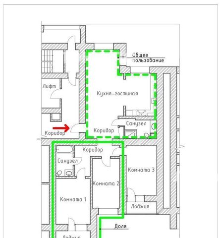 Холл с грузовым лифтом отсечен широкой двустворчатой металлической дверью. Есть выход на общий лестничный балкон и с него - на пожарную лестницу.