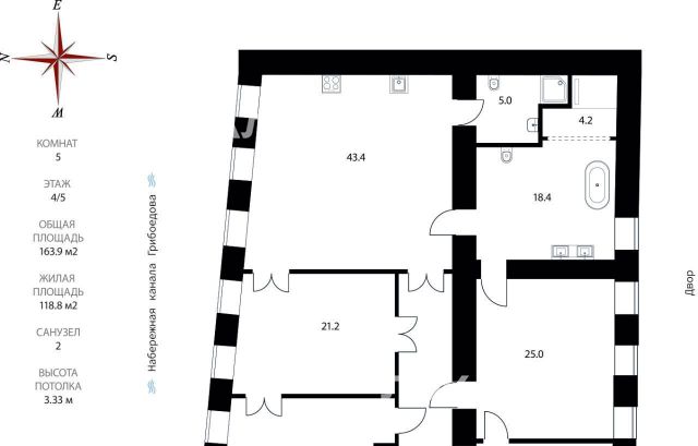 Просторная 4-комнатная квартира на Канале Грибоедова