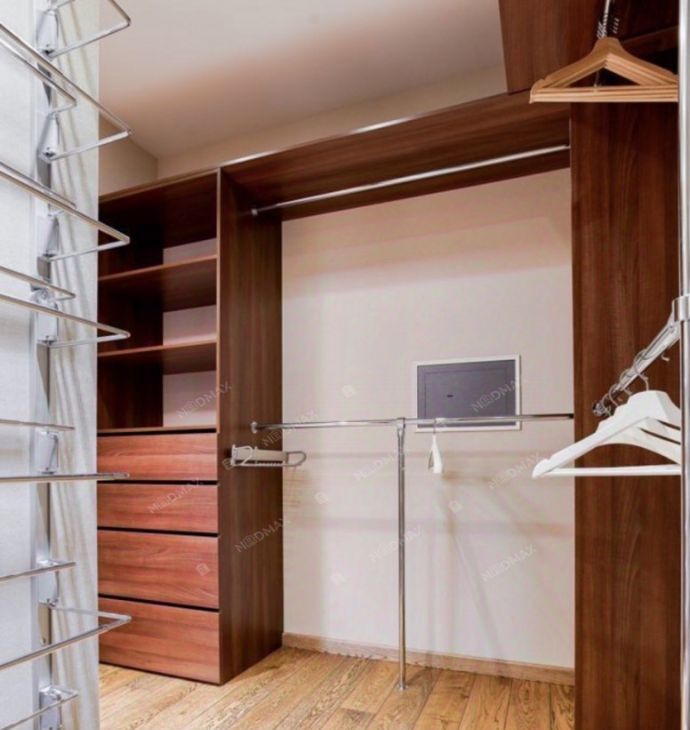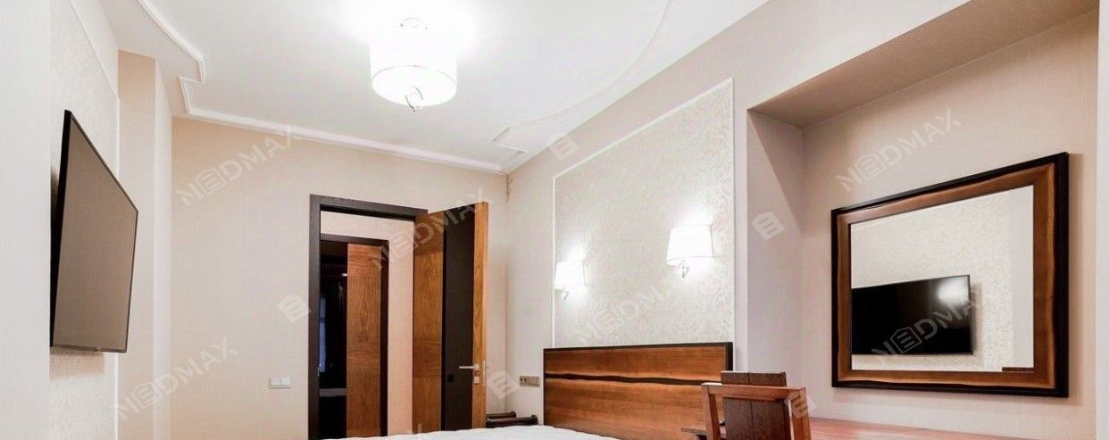 Планировка квартиры включает в себя: кухню-гостиную, спальню, две комнаты свободного назначения которые можно использовать под кабинет, детскую и комнату для гостей, большая вместительная гардеробная комната, два санузла, сауну. Есть парковка во дворе