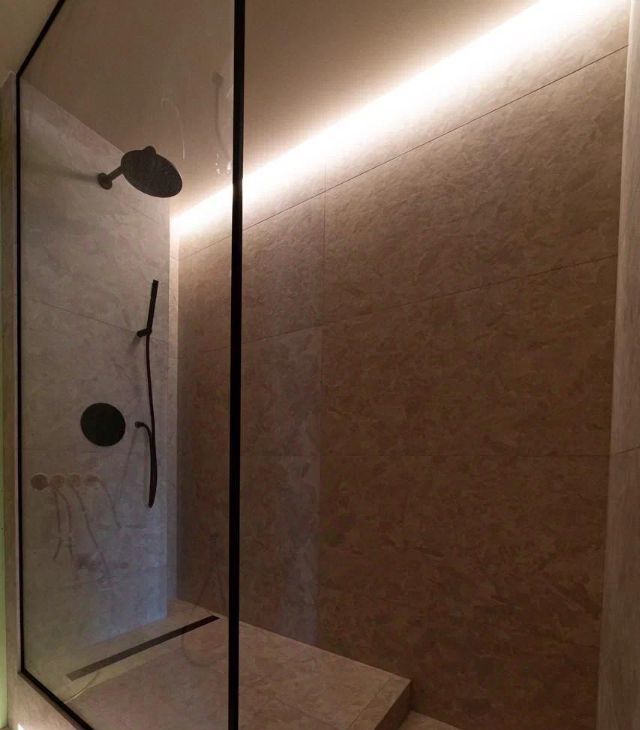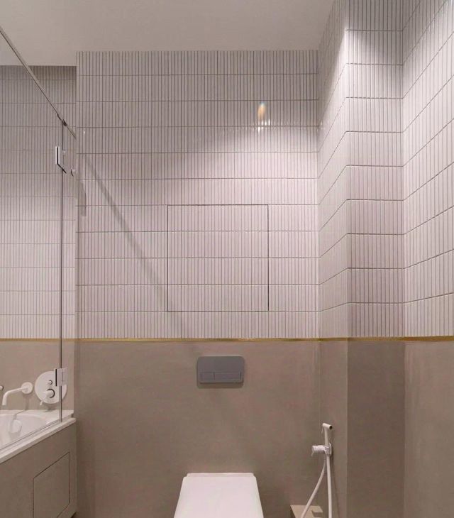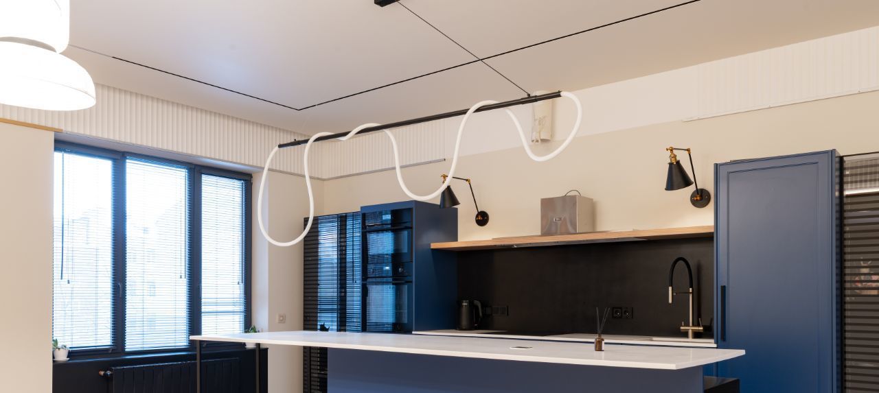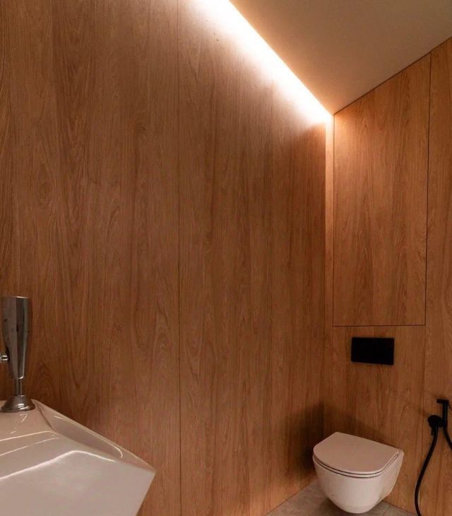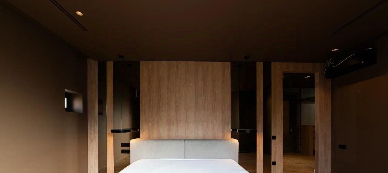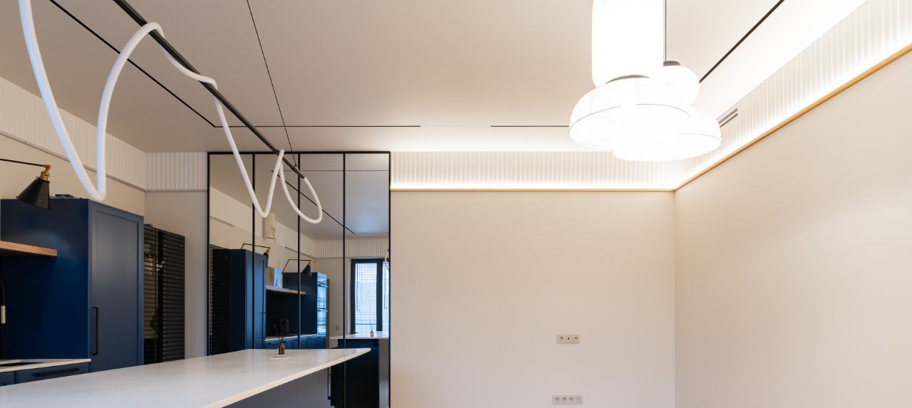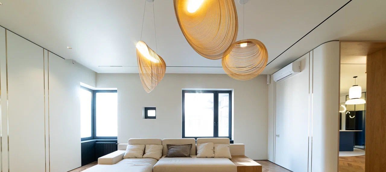 • Радиусные (закругленные) углы стен, создающие мягкую геометрию. Эффект парящих стен за счет теневых профилей и скрытых плинтусов.