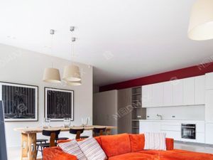 Просторная кухня-гостиная, оснащённая современной техникой. Обеденная зона объединена с зоной отдыха, при необходимости пространства могут быть зонированы раздвижной перегородкой.
