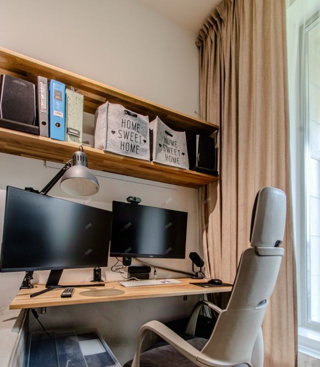 Интерьер оснащен необходимой мебелью и системами хранения, техникой.