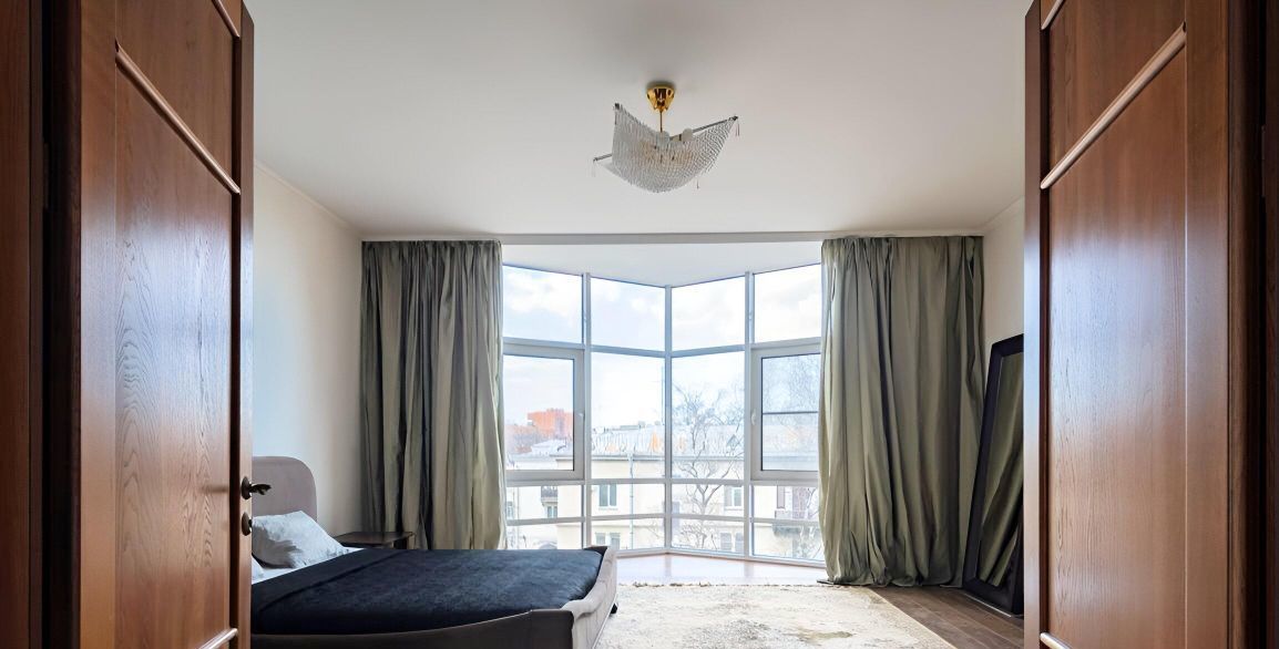 •Квартира отличается продуманной двухсторонней планировкой, благодаря чему она наполнена светом и ощущением простора. Из гостиной открывается живописный вид на воду и Елагин остров.