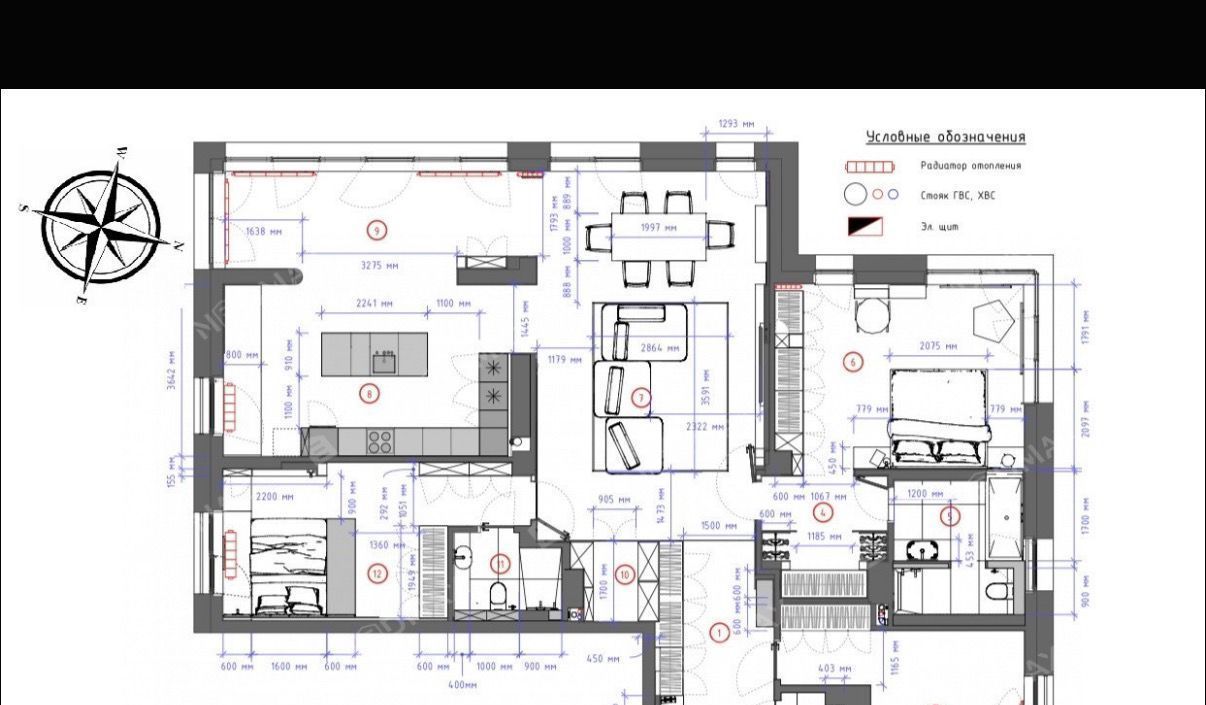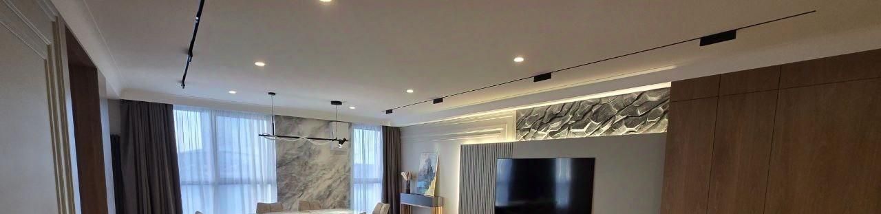 - Просторная гостиная объединена с кухней-столовой, дополнена панорамным видом на залив и Лахта Центр. Реализованы различные сценарии освещения, установлены шторы блэкаут.