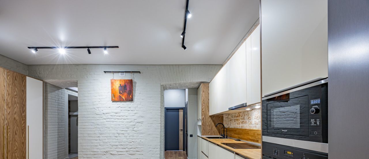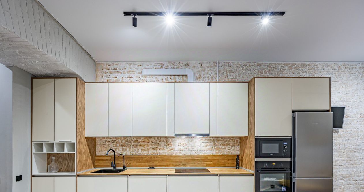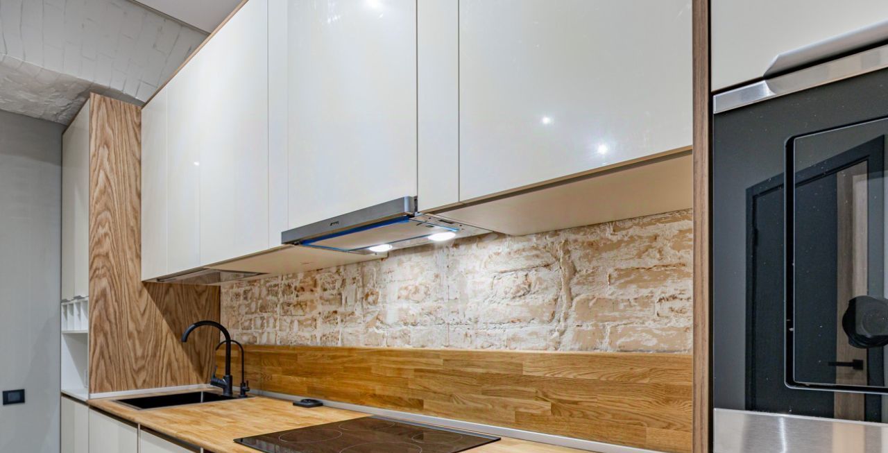 Встроенная кухня оборудована множеством мест хранения и бытовой техникой.