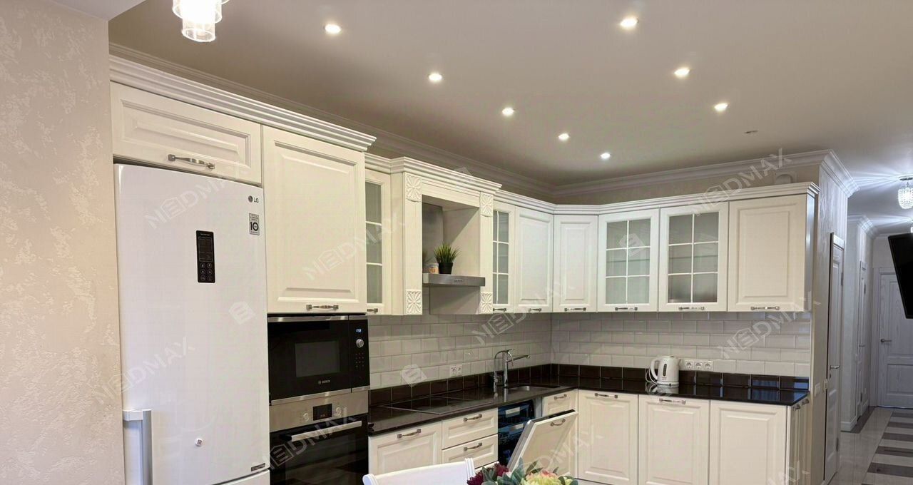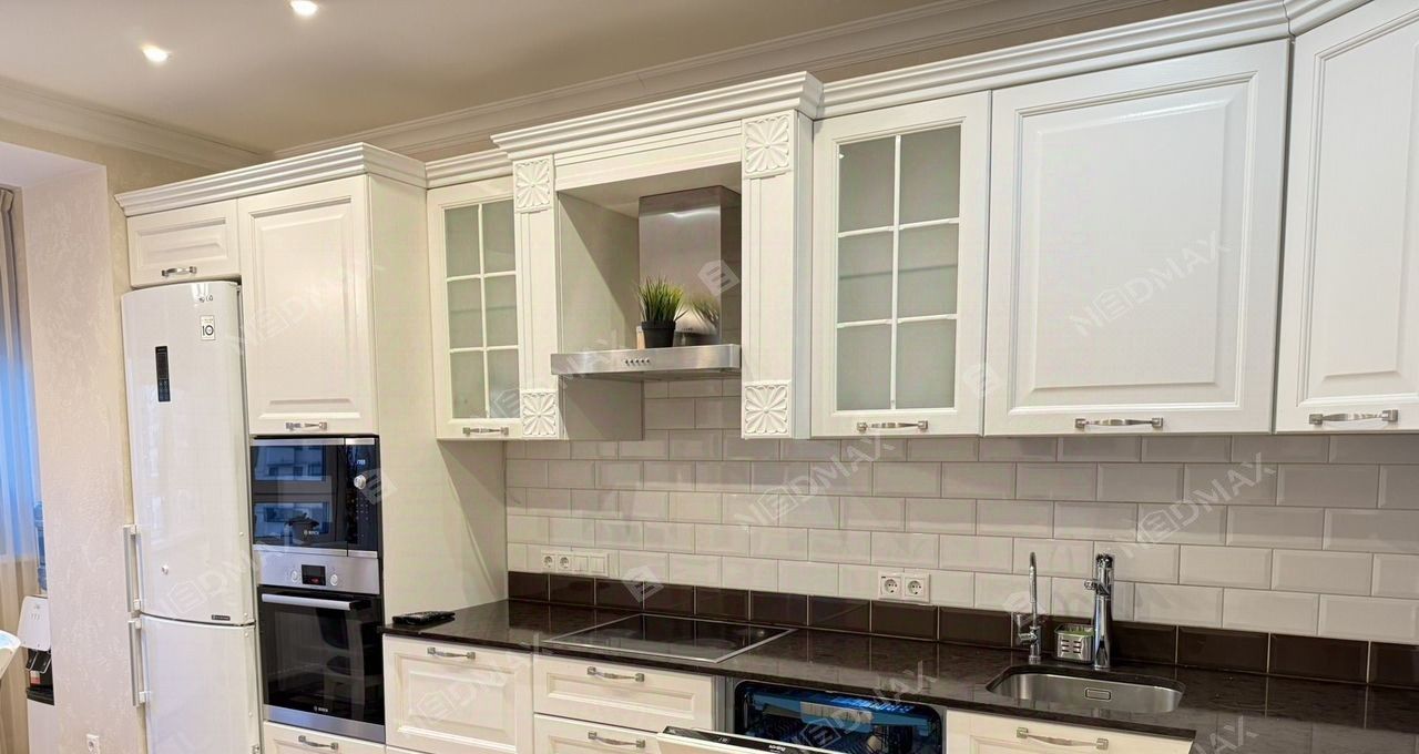 Большая кухня, укомплектованная всей необходимой техникой (духовой шкаф, СВЧ, посудомоечная машина, холодильник)
