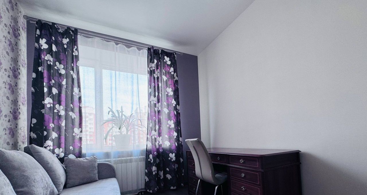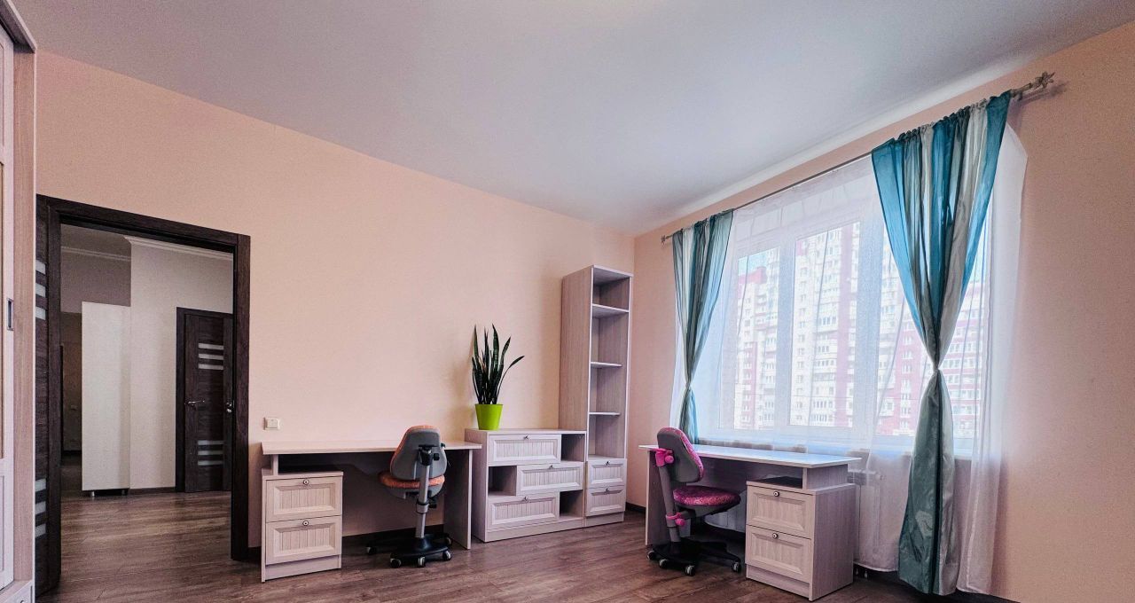 Третья отдельная комната с диваном, большим дорогим рабочим столом, стулом и шкафом для вещей может стать кабинетом, гостевой или дополнительной детской.