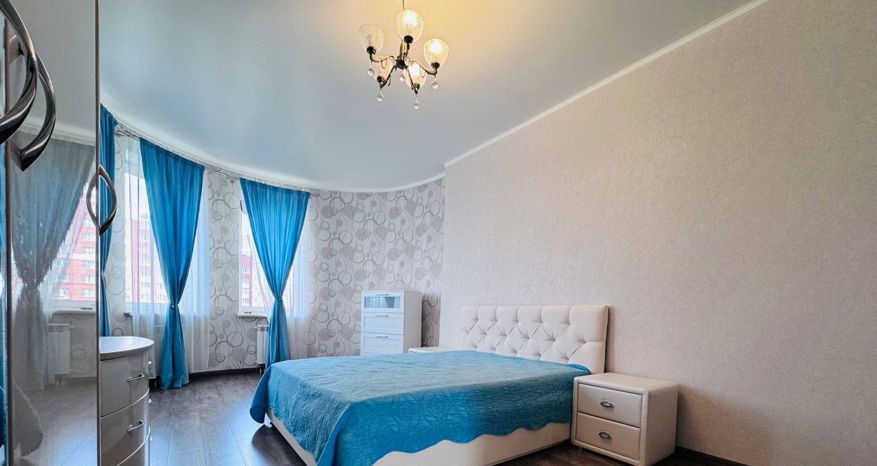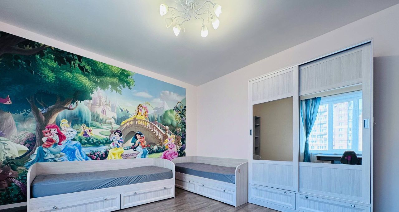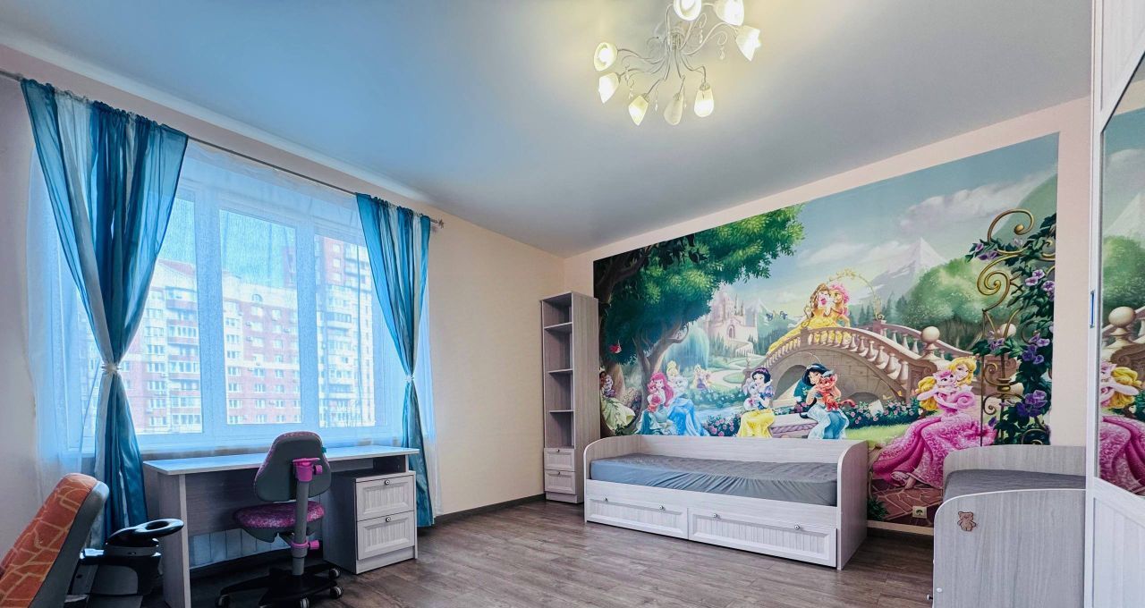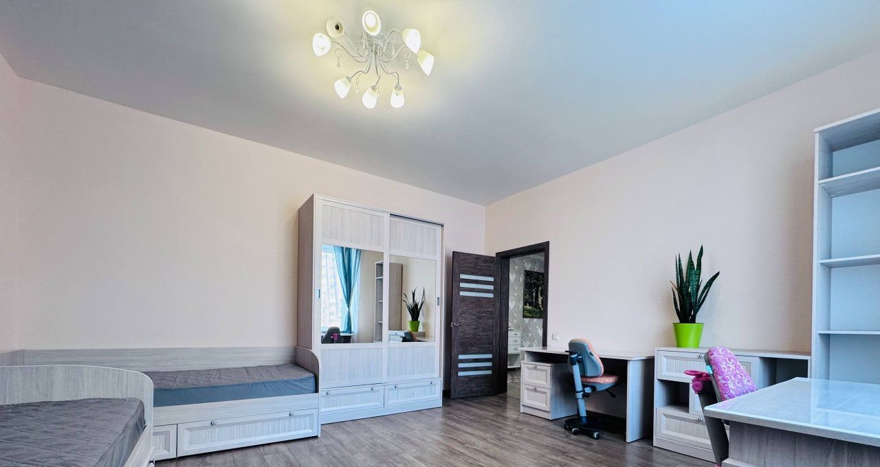 Родительская спальня это настоящий оазис спокойствия с шикарной двуспальной кроватью, шкафом, комодом, тумбой, рабочим столом и очистителем воздуха. Панорамный вид и эркер добавляют ей особого шарма.