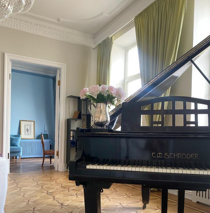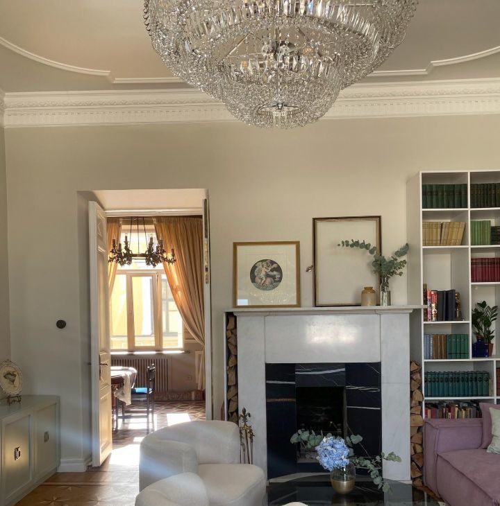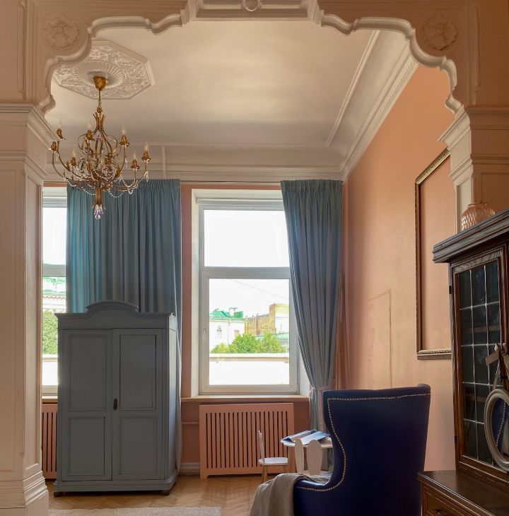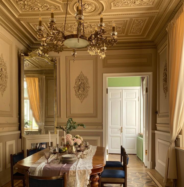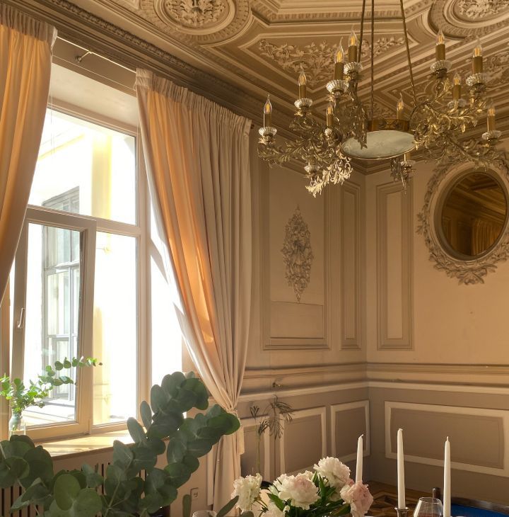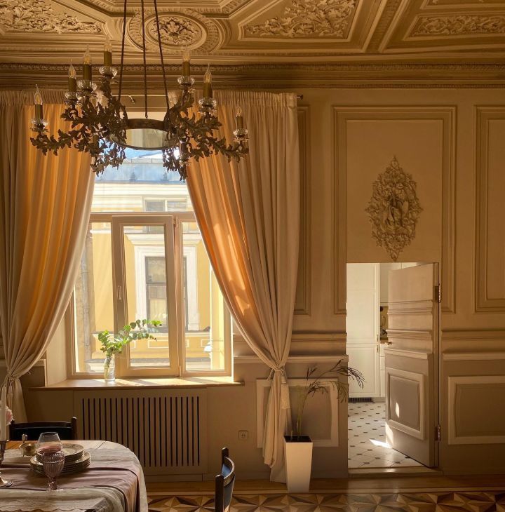 В квартире выполнена реставрация сохранившихся интерьеров по сохранившимся эскизам, произведён качественный ремонт. Сохранены и бережно восстановлены старинная лепнина потолков и стен, настенные панели, наборный паркет полов. Сохранена историческая планировка. В вашем распоряжении будут светлая прихожая, великолепная столовая с изящными лепными картушами, зеркальными медальонами в световых окнах; гостиная с действующим камином и роялем К.М.Шрёдера времён постройки дома и парадная комната свободного назначения, которая может быть вашим кабинетом или уголком отдыха. Интерьеры дополняет уютная спальня с балконом и отдельным санузлом, где есть французская ванная и душевая на выбор. В бывших в XIX веке служебных местах квартиры сейчас гостевой санузел и кухня по последнему слову техники от умной стиральной машины до тостера и чайного сервиза.