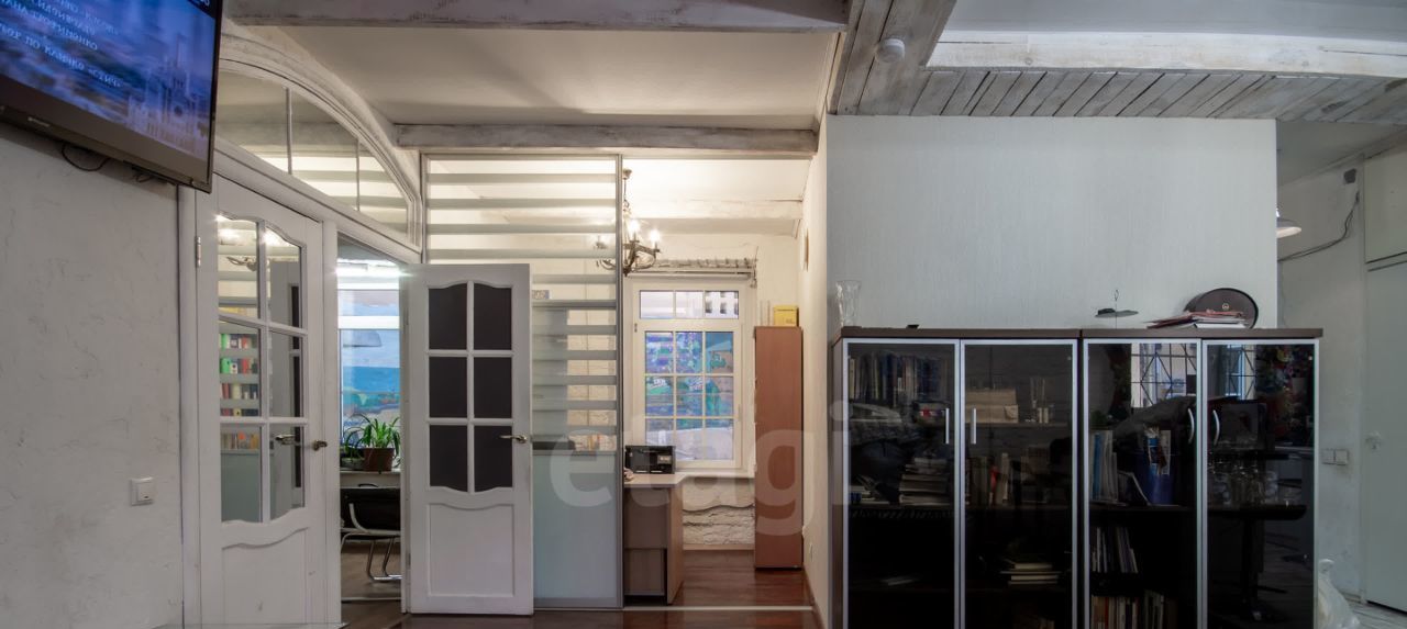 Планировка включает в себя кухню-гостинную, две изолированные комнаты, одну смежную комнату, раздельную ванную комнату и просторный коридор с зоной отдыха и выходом на улицу, где можно отдыхать летом. Квартира ранее служила небольшим офисом.