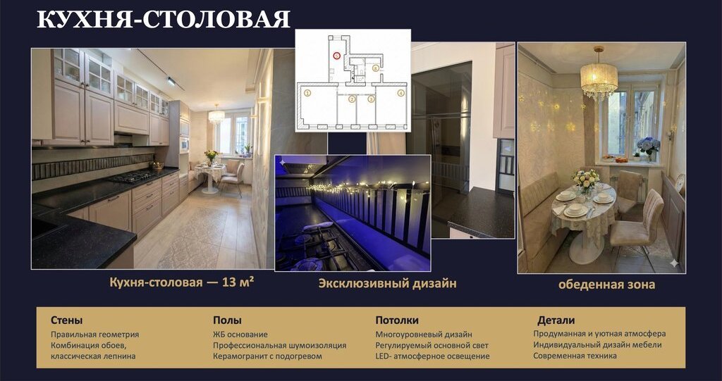 Кухня-столовая (13 м²): укомплектована современной встроенной техникой и мебелью по индивидуальному проекту.