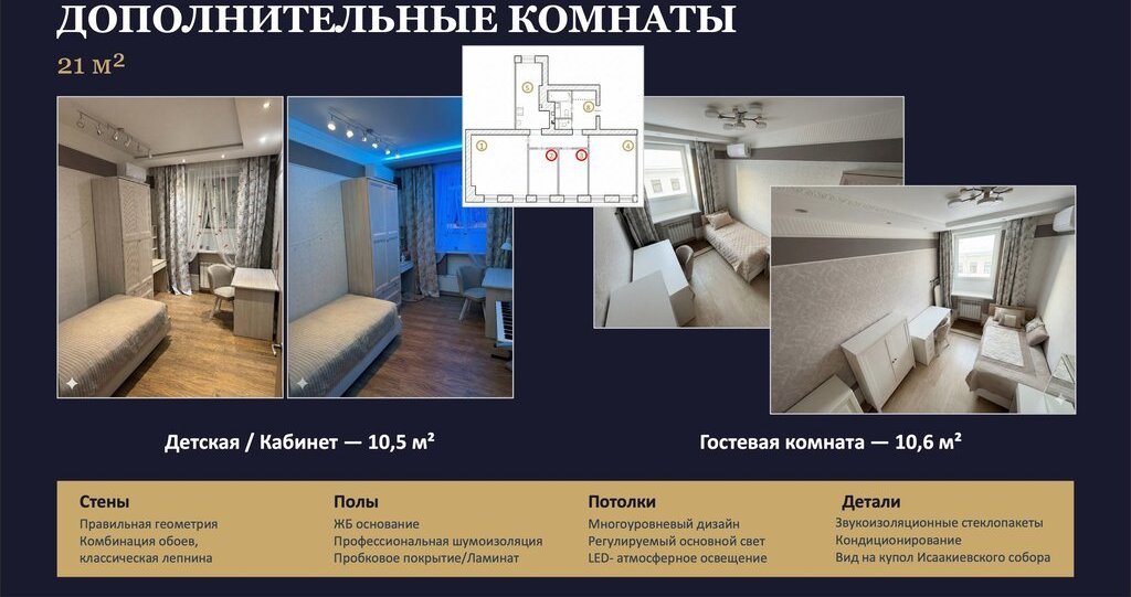 Дополнительные комнаты (10.6 и 10.5 м²): идеально подойдут под детскую, кабинет или гостевую.