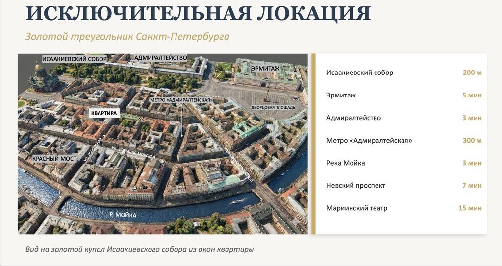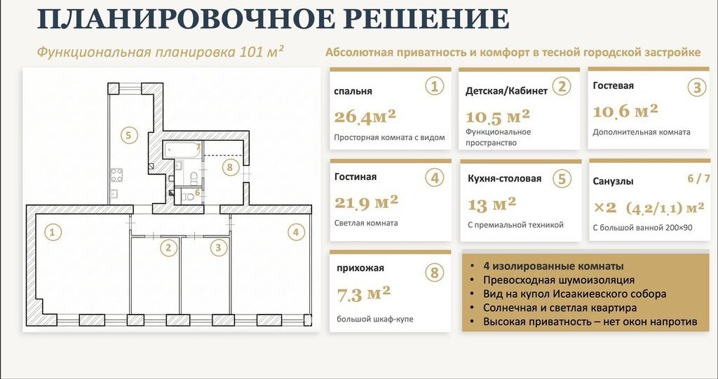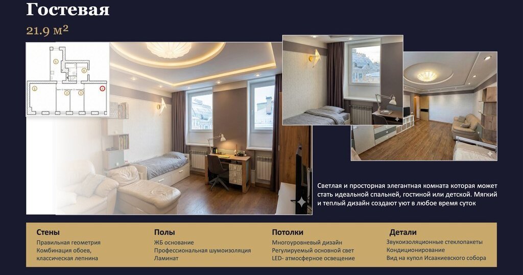 Спальня (26.4 м²): просторная, правильной геометрии, с видом на купол Исаакиевского собора. Оснащена кондиционером и звукоизоляционными стеклопакетами.