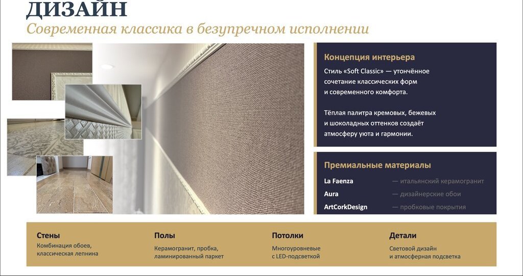На площади 101 м² реализована функциональная планировка с 4 изолированными комнатами. Интерьер выполнен в стиле «Soft Classic»: спокойная палитра кремовых, бежевых и шоколадных оттенков, создающая атмосферу гармонии и уюта.