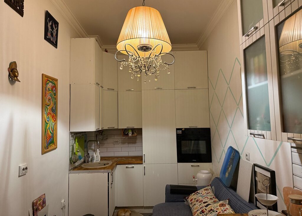 На кухне окна в тихий двор, есть раскладной диван икеа.