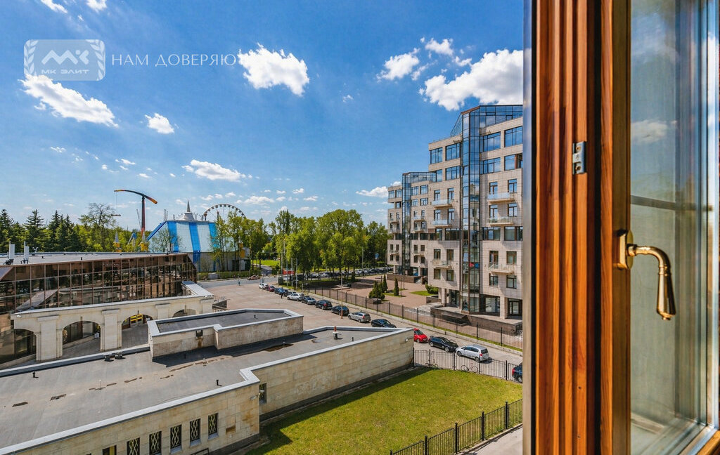 Вид на зелень Приморского парка Победы и красивый охраняемый двор, с круглосуточным контролем доступа на территорию.
