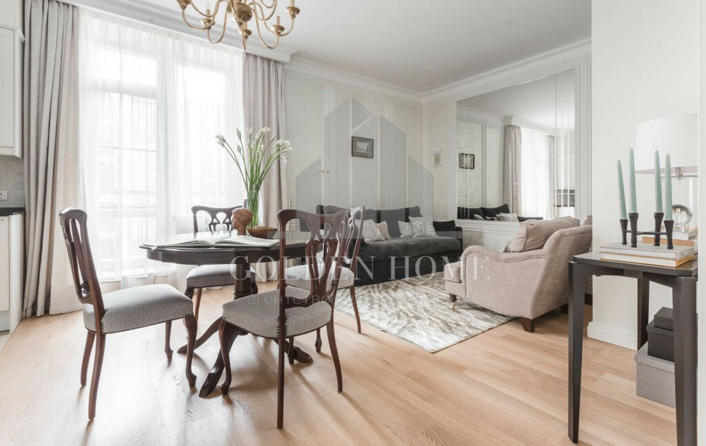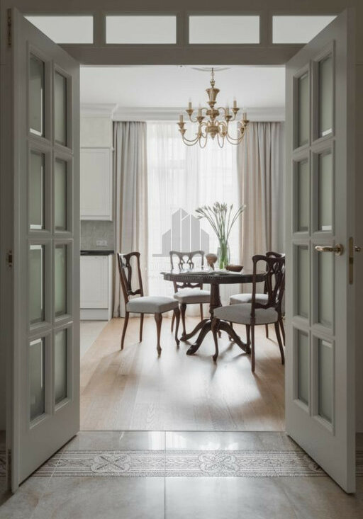 Сохранены высокие потолки, сделана дополнительная шумоизоляция, при отделке использовались только натуральные материалы.