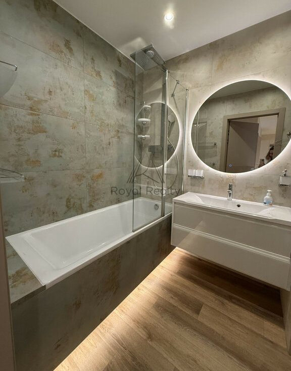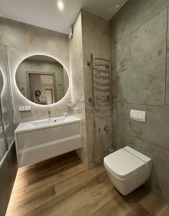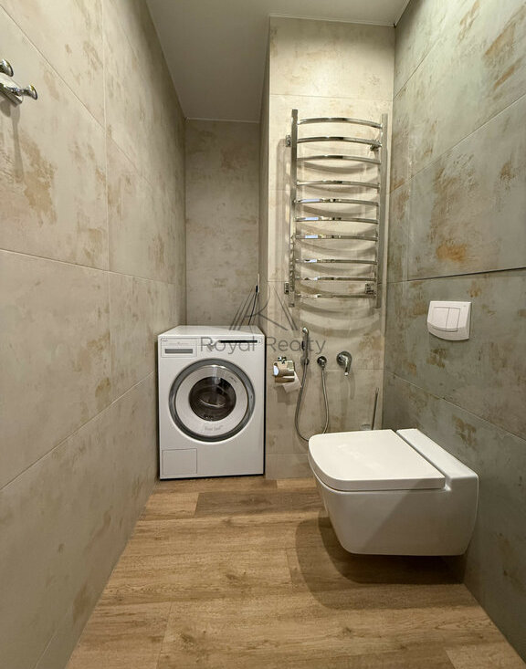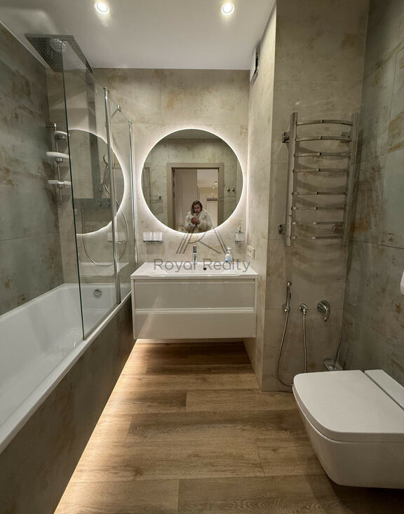 Квартира полностью готова к проживанию: выполнен качественный современный ремонт, установлены кондиционеры, посудомоечная машина, предусмотрены системы хранения и вся необходимая бытовая техника и мебель для комфортной жизни.