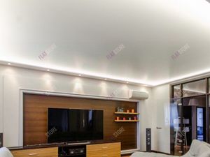 В гостиной большой удобный диван, телевизор и аудиосистема домашнего кинотеатра.