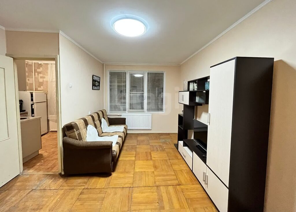 • Гостиная оборудована раскладным диваном, стенкой и телевизором, окна выходят на стадион и школу.
