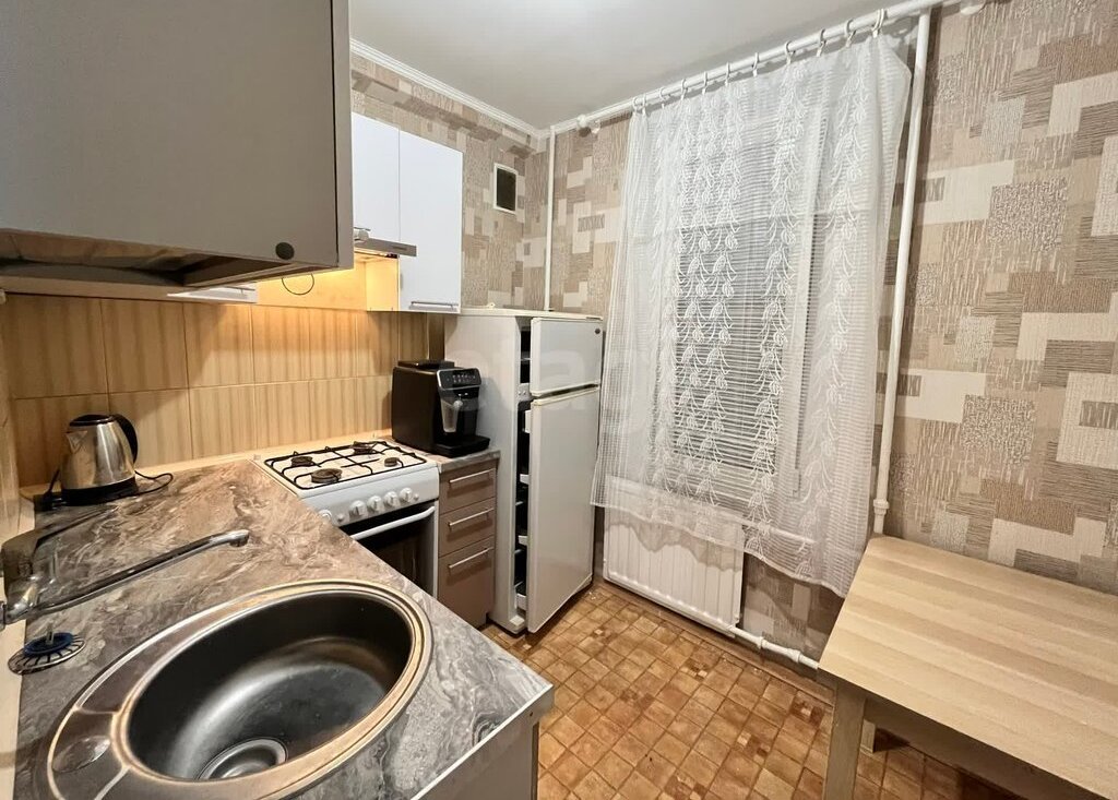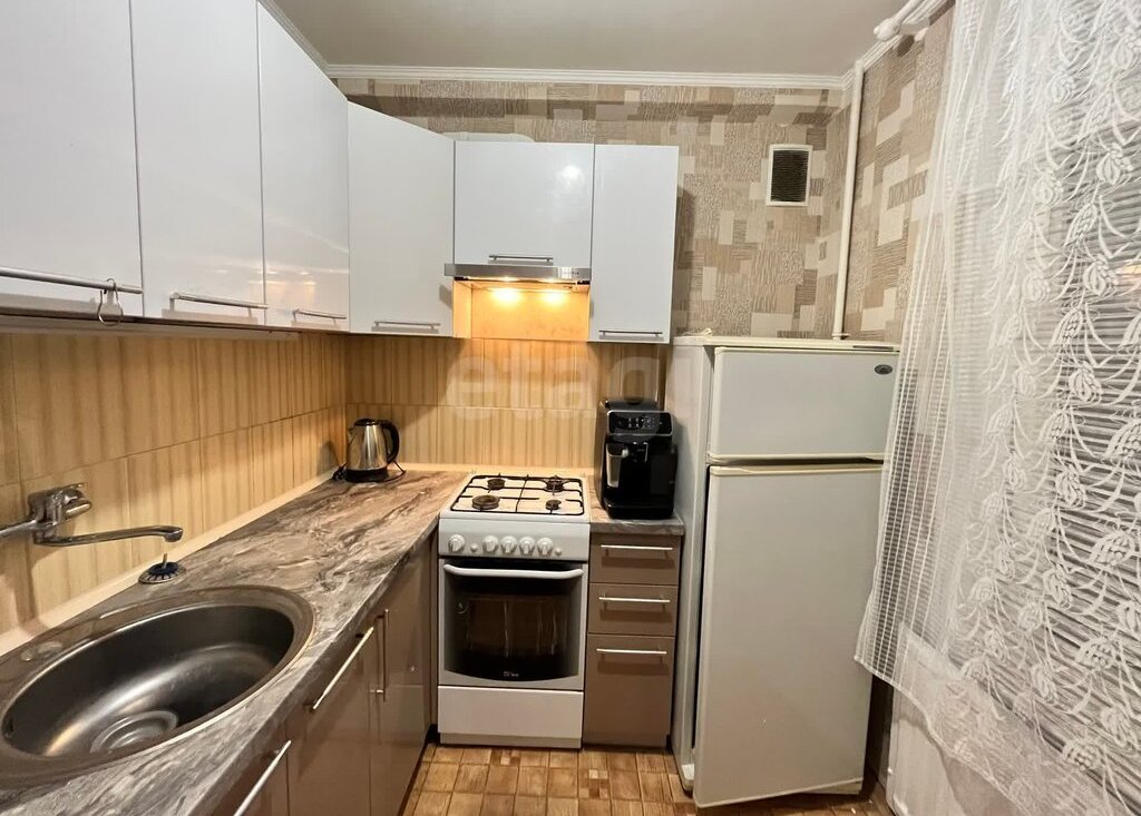 • Кухня (6 м²) укомплектована всей необходимой бытовой техникой: холодильник, газовая плита с духовым шкафом, чайник и вытяжка.