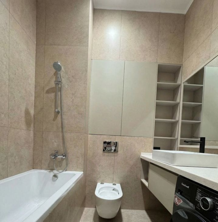 В квартире сделан дизайнерский ремонт, что придает ей уникальный и современный вид. Все комнаты полностью меблированы, на кухне и в комнатах установлена необходимая мебель. Просторная кухня площадью 24 кв. м оснащена всей необходимой техникой: холодильником, посудомоечной машиной, стиральной машиной и кондиционером. В квартире есть два совмещенных санузла, в одном установлена ванна, в другом — душевая кабина. Для вашего удобства в квартире также есть две лоджии, где можно насладиться утренним кофе или вечерними видами.