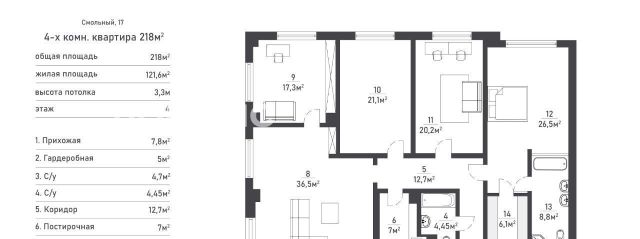 5-комнатная квартира: Санкт-Петербург, Смольный проспект, 17 (218 м²)