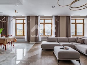 Панорамные виды, достойные кисти художника: Восемь окон этой угловой квартиры словно живые картины, сменяющие друг друга в зависимости от времени суток. Из окон открывается завораживающий вид на величественную Неву и изящный мост Императора Петра Великого. Другие четыре окна гостиной, кухни-столовой и еще одного кабинета предлагают насладиться видом на устремленный ввысь Смольный собор и элегантное здание Правительства Петербурга.
