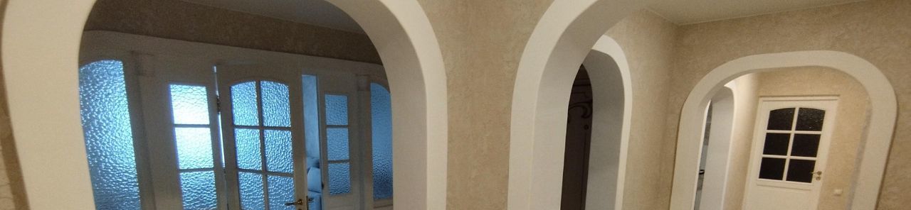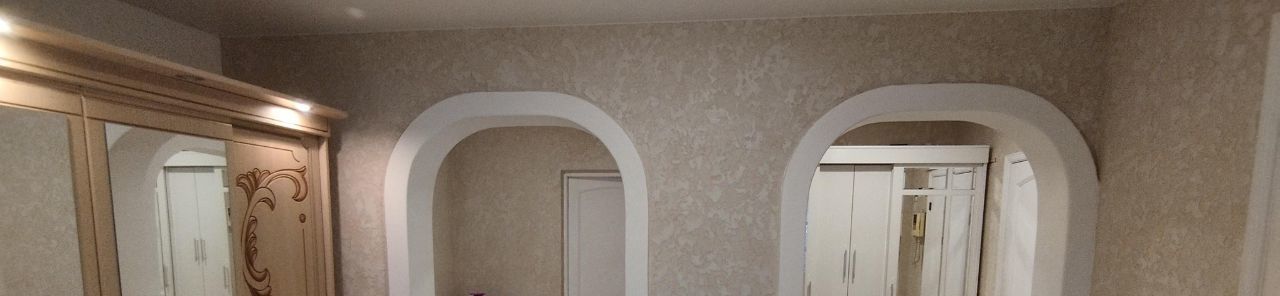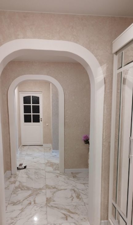 В коридоре стены оформлены венецианской штукатуркой с белыми арками. Тут имеются два встроенных шкафа.